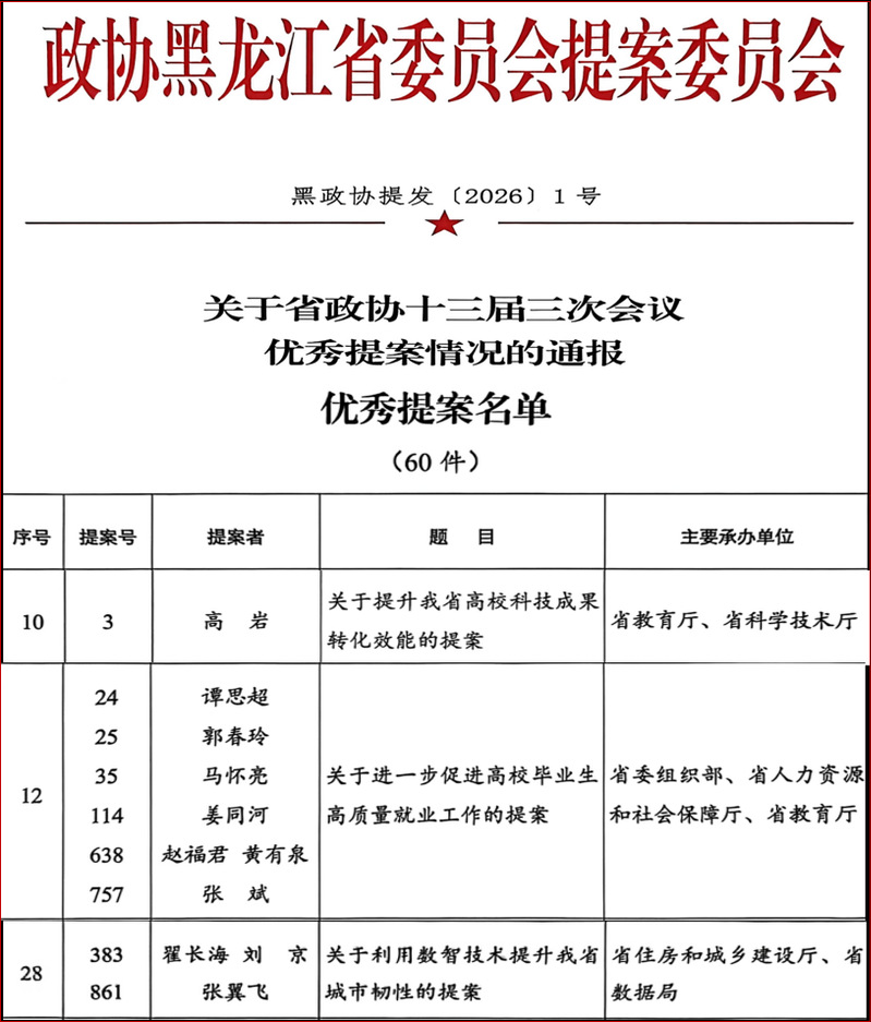 在省政协十三届三次会议以来,广大政协委员共提交提案1137件。经审查立案992件。在此次优秀提案评选中,我校3位委员的提案成功入选:高岩委员《关于提升我省高校科技成果转化效能的提案》,聚焦成果转化痛点,提出契合龙江实际的系统性对策,获得承办单位高度评价;谭思超委员《关于进一步促进高校毕业生高质量就业工作的提案》,紧扣民生关切,相关建议已被有关部门采纳;张翼飞委员《关于利用数智技术提升我省城市韧性的提案》,立足数字龙江建设,为城市高质量发展注入新思路。在个人履职方面,陈恒委员荣获省政协2025年度“履职优秀委员”称号,并在反映社情民意信息量化考核中跻身全省前50位,受到省政协通报表扬。其报送的多篇高质量信息为党委政府科学决策提供了有力支撑。